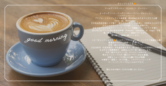 この商品は、「ゴールデンマウンテン」マンチケラ・ピーベリーのオレンジショコラコーヒーです。ブラジル・ミナスジェライス州南部のマンチケラ山脈で育てられた希少なイエローブルボン種のピーベリー豆を中深煎りから深煎りに仕上げました。